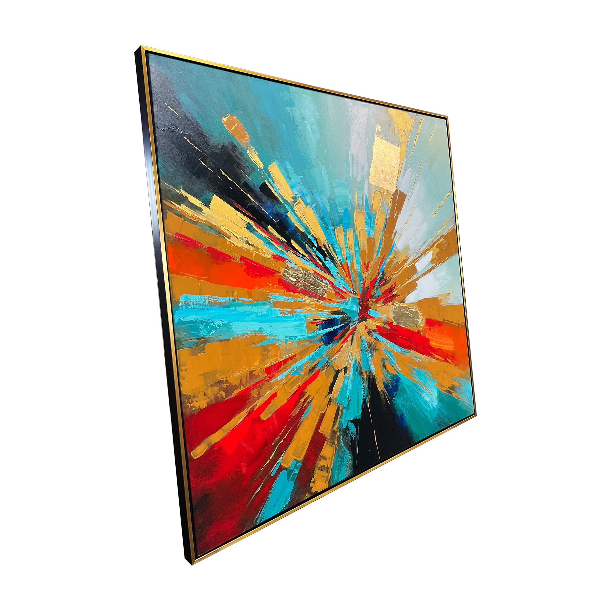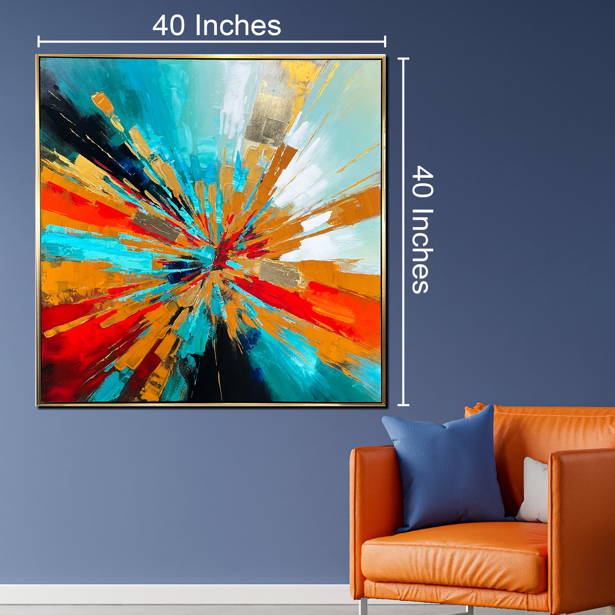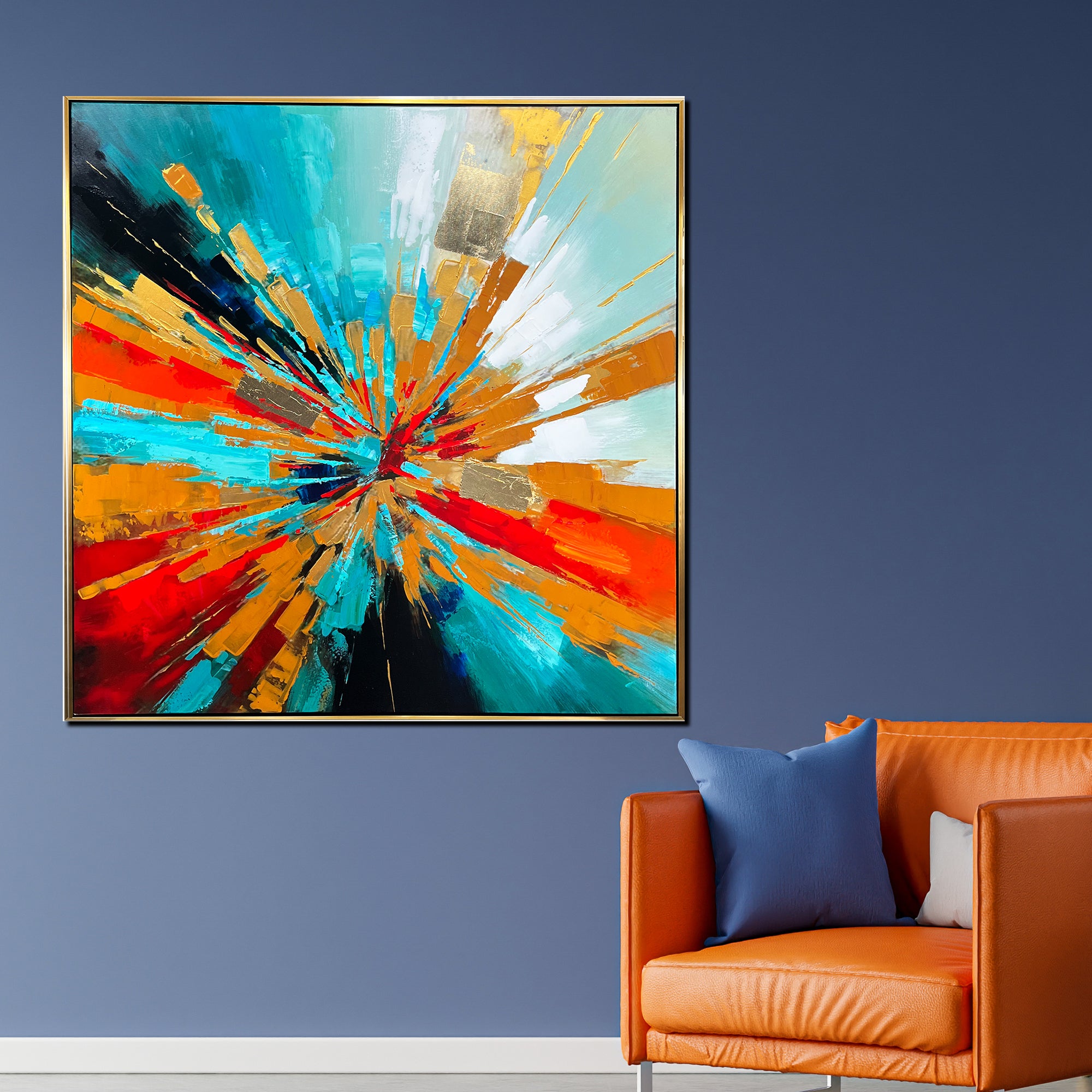 Color Explosion" is an exhilarating hand-painted wall art that epitomizes the vibrant energy and dynamic movement of an abstract explosion of colors. This captivating piece features a radiant array of vivid hues, including deep blues, fiery reds, and bright oranges, emanating from a central focal point and spreading outward in a dramatic display of chromatic brilliance. Perfectly suited for any modern living room, it serves as a striking focal point, injecting life and color into the space. As a home decoration item, it is ideal for those looking to add a statement piece to their wall painting collection for the home, offering both aesthetic pleasure and a bold visual impact. The artwork's bold and bright composition makes it an indispensable element of contemporary home decor, transforming any living environment into a vibrant and engaging space that captures the essence of modern artistic expression and design.