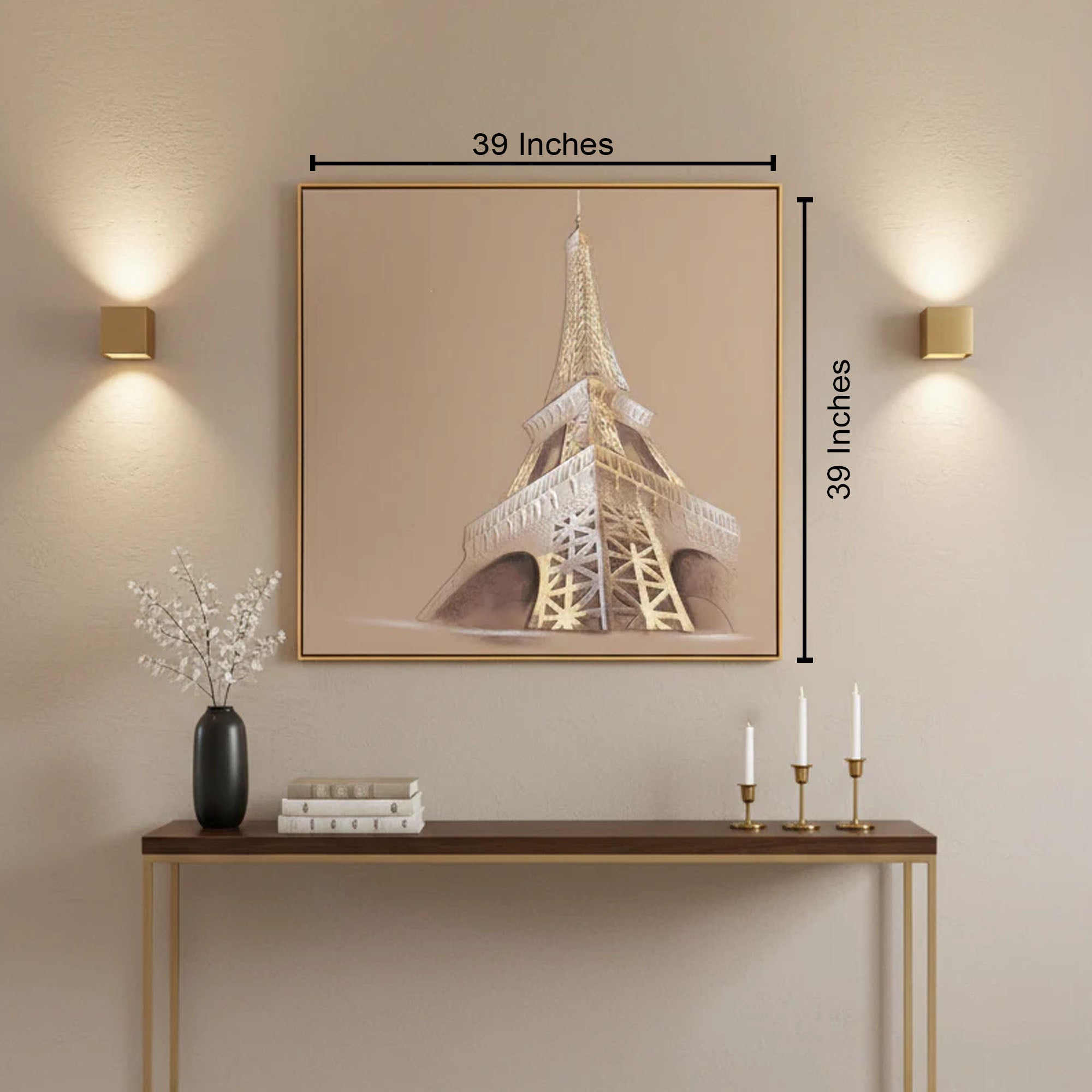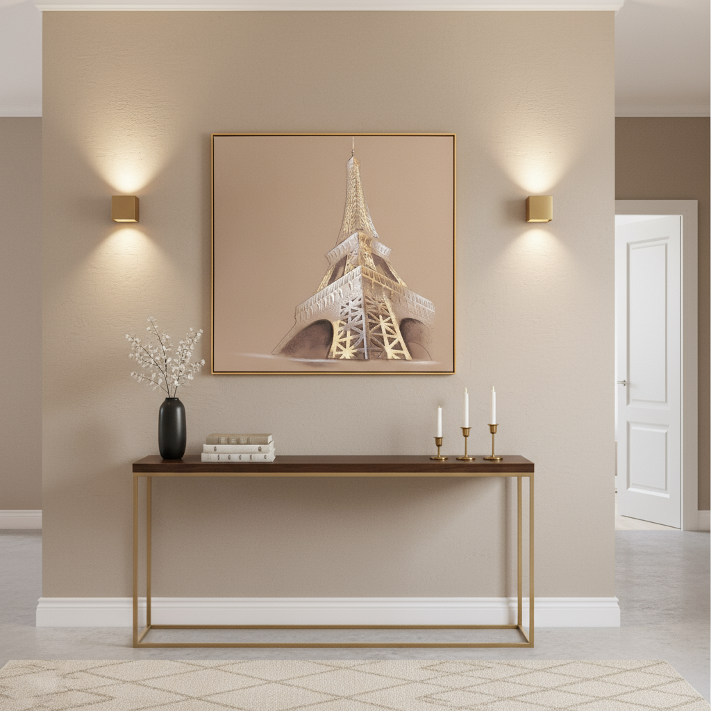 Evoking the romance of Paris, this artwork presents the Eiffel silhouette with poised geometry that instantly elevates Wall Paintings for Home, adding a refined, cosmopolitan focal point to living rooms, bedrooms, and entryways as a versatile Wall Decoration Item that complements neutral palettes and soft metallic accents while guiding the eye upward with elegant structure and calm balance as a thoughtfully curated Home Decor Product among Items for Home decoration that brings travel-inspired charm, vertical rhythm, and timeless sophistication, creating an inviting gallery-like presence that feels modern yet classic for carefully styled interiors seeking subtle shine and enduring allure.